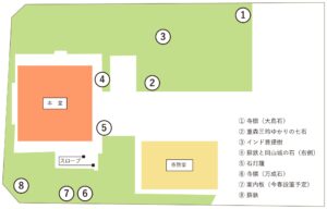 ➄ 石灯籠 | 上野寛永寺にある徳川家11代将軍家斉公の墓前に第11代備中国足守藩主の木下利愛公が献灯されたもの 高さ3.5メートル 重さ4トン 御寄進‥故・石渡千代さま(住職祖母) |