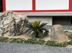 ④ 蘇鉄と岡山城の石(右側) | 宇喜多秀家卿が八丈島の邸宅にお手植えされた蘇鉄を株分けしたものと岡山城外堀石垣の石 |